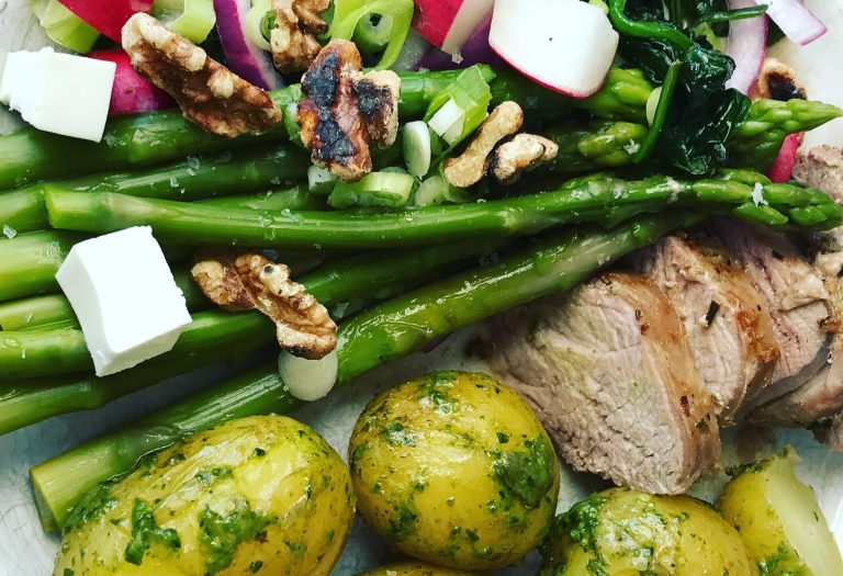 Skjær av den nederste biten på aspargesene og damp disse 2-3 minutter i en kjele med veldig lite vann (bare nok til at det ikke koker bort). Jeg spruter over litt flytende smør så de blir smørdampet. Før servering strø litt maldonsalt over.