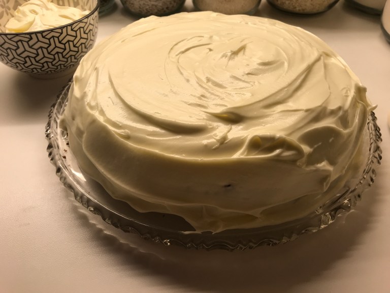 Smør sitronkremen over toppen og rundt kaken og pynt med litt karamell.