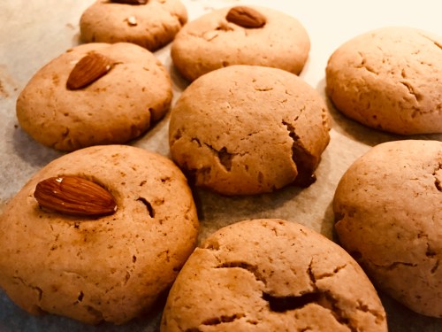 Trykk noen hakkede mandler i en cookie og legg en hel mandel på toppen.