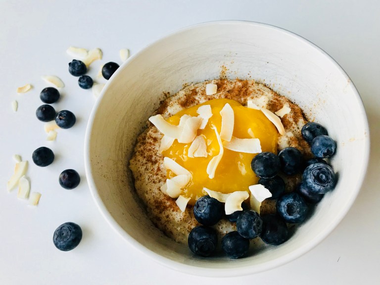 Pynt med blåbær og kokosflak.