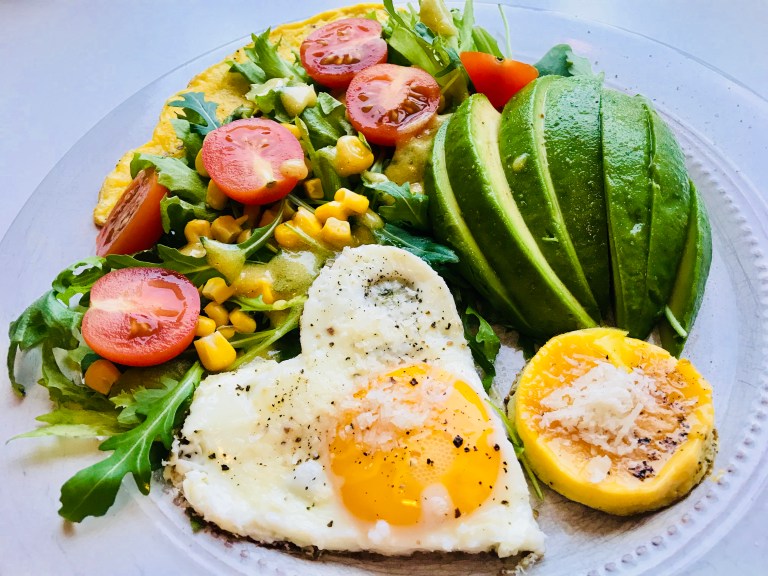 Jeg har stekt eggene i former i stekepannen. Ett egg er helt og ett egg er vispet.