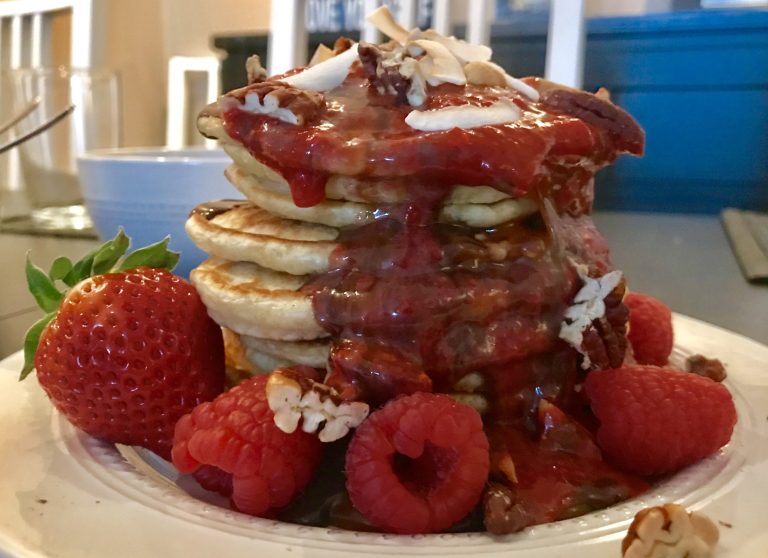 I tillegg til alle disse gode sausene så er det godt med friske bær, banan og kokosflak.