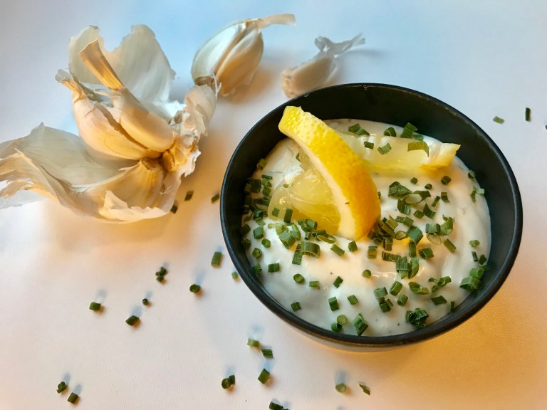 Ha alt, bortsett fra gressløken, i en blender og kjør til en jevn og fin saus.