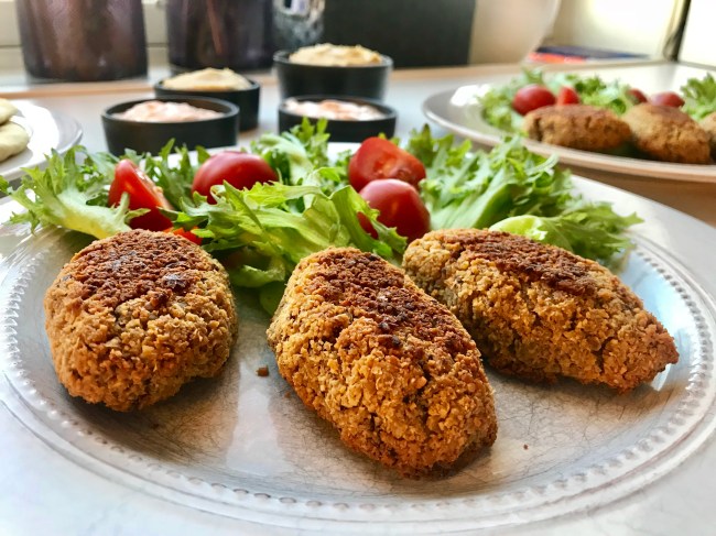 Her har jeg stekt falaflene i ovnen men de kan også stekes i olje i en stekepanne.