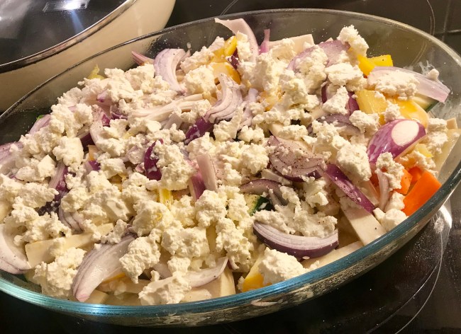 Smuldre fetaosten over og til slutt helles matfløten over.