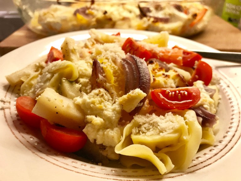 Pasta legges først på tallerkenen, grønnsakene over, strø over revet parmesan