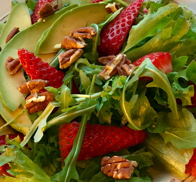 Crispsalat, ruccola, jordbær, pekannøtter og avokado.
