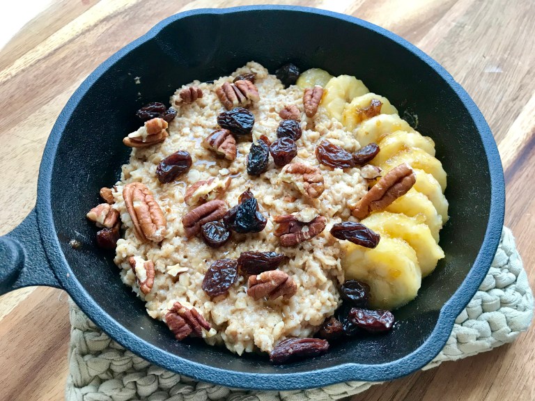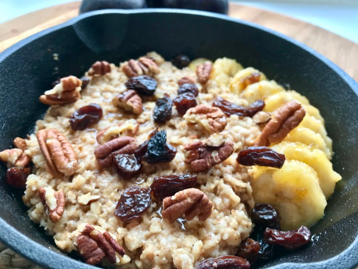 Legg grøten i sammen med bananen. Ha på hakkede pekannøtter, rosiner og sirup.