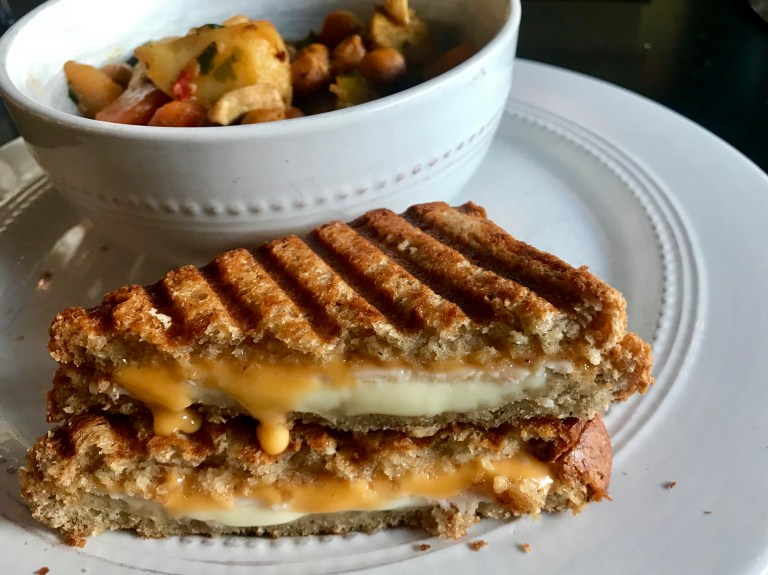 Legg på mozzarella, cheddar og en skive kyllingfilèt og stek i grilljern.