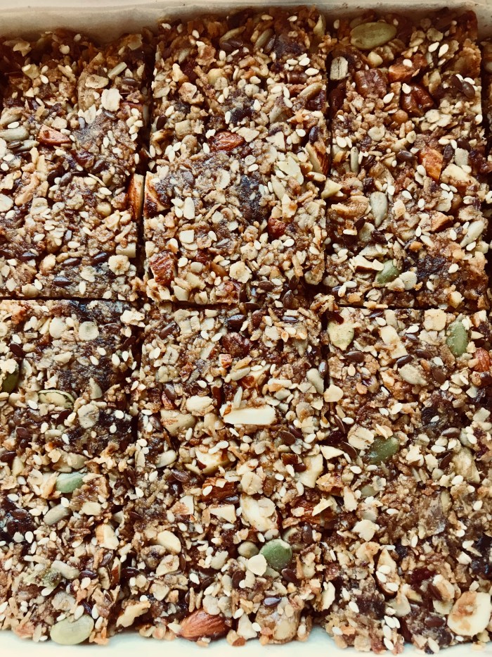 Hakk alle nøttene i mindre biter og bland sammen med resten av de tørre ingrediensene.
