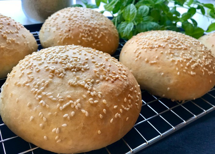 Hjemmelaget hamburgerbrød og hjemmelaget coleslaw.