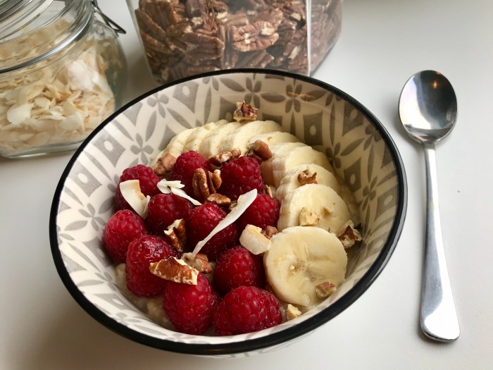 Legg på skivet banan, bringebærbær, hakkede stekte pekannøtter og kokosflak.