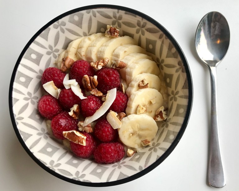 Legg på skivet banan, bringebærbær, hakkede stekte pekannøtter og kokosflak.