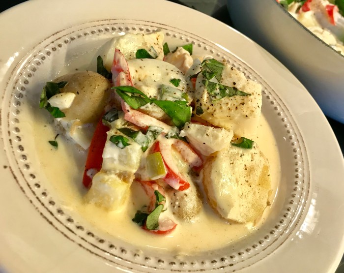 Kjempegod og kremet fiskegryte, eller tykk fiskesuppe, med torsk og poteter.