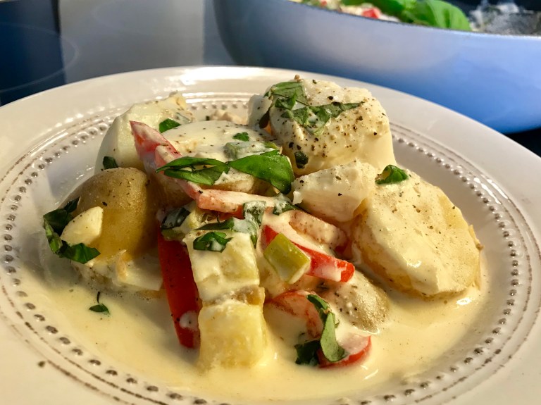 Kjempegod og kremet fiskegryte, eller tykk fiskesuppe, med torsk og poteter.