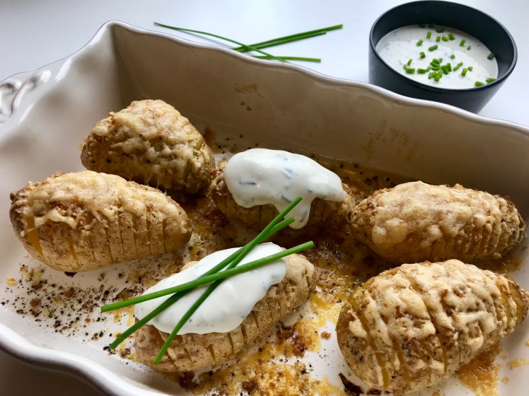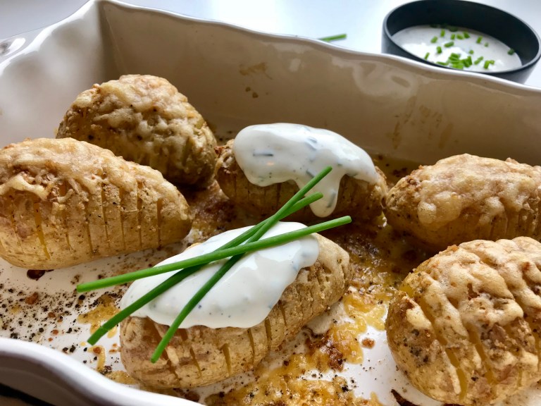 Vask potetene og skjær skiver nesten igjennom, de skal holde sammen i bunnen.