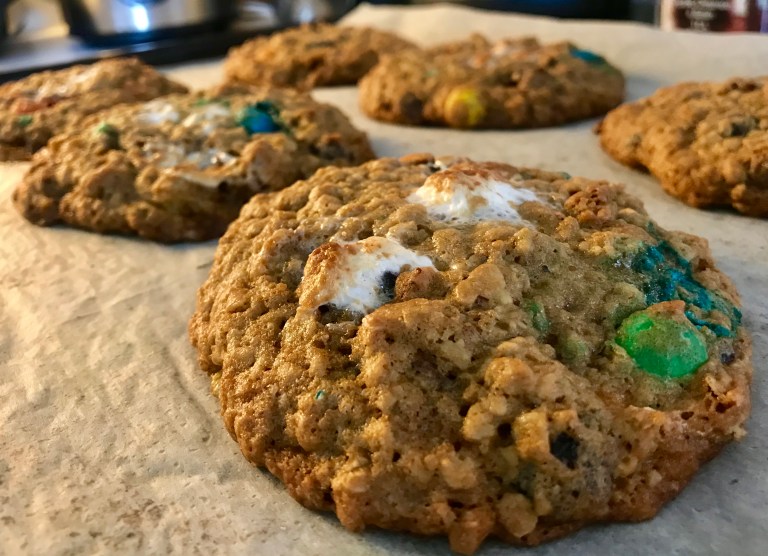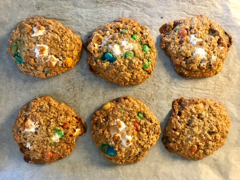 Til slutt vendes marshmallows, pekannøtter, tranebær og sjokolade inn.