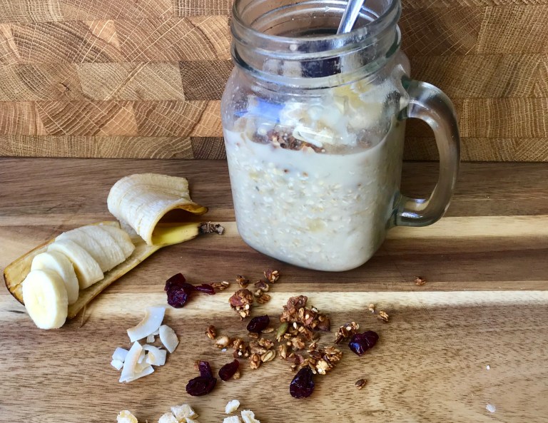 Bland havregryn, havremelk, lønnesirup, most banan og halvparten av kokosflakene.