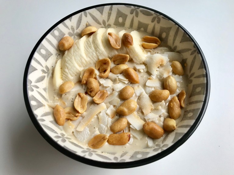Om morningen har du over de siste kokosflakene, bananskiver og peanøtter.