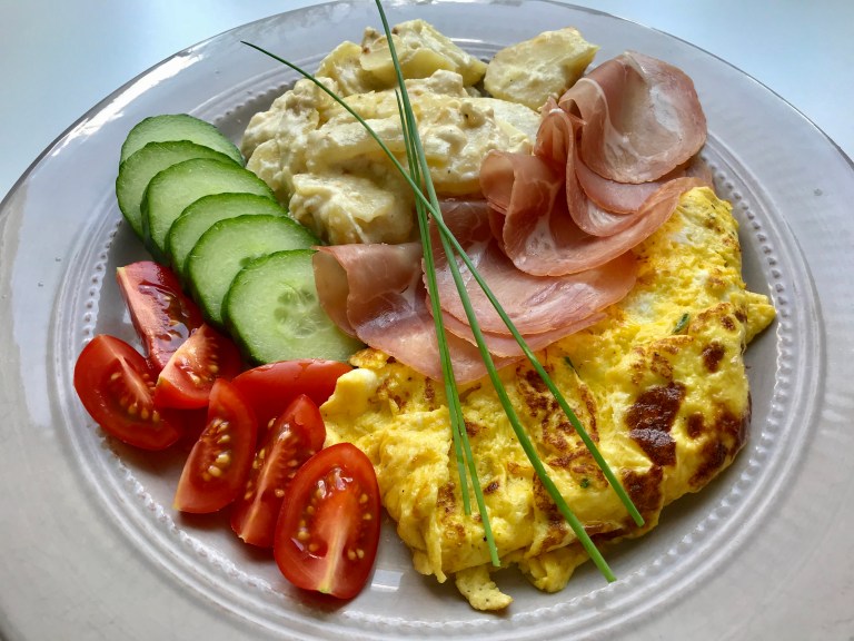 Brett omeletten dobbel og legg på tallerken sammen med resten av ingrediensene.