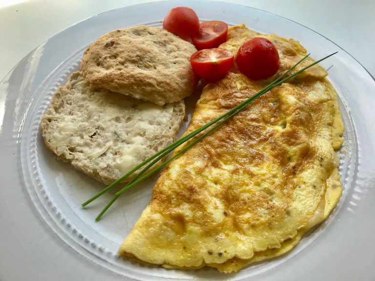Stek på lav varme til eggene er stivnet og brett halvparten av omeletten over.
