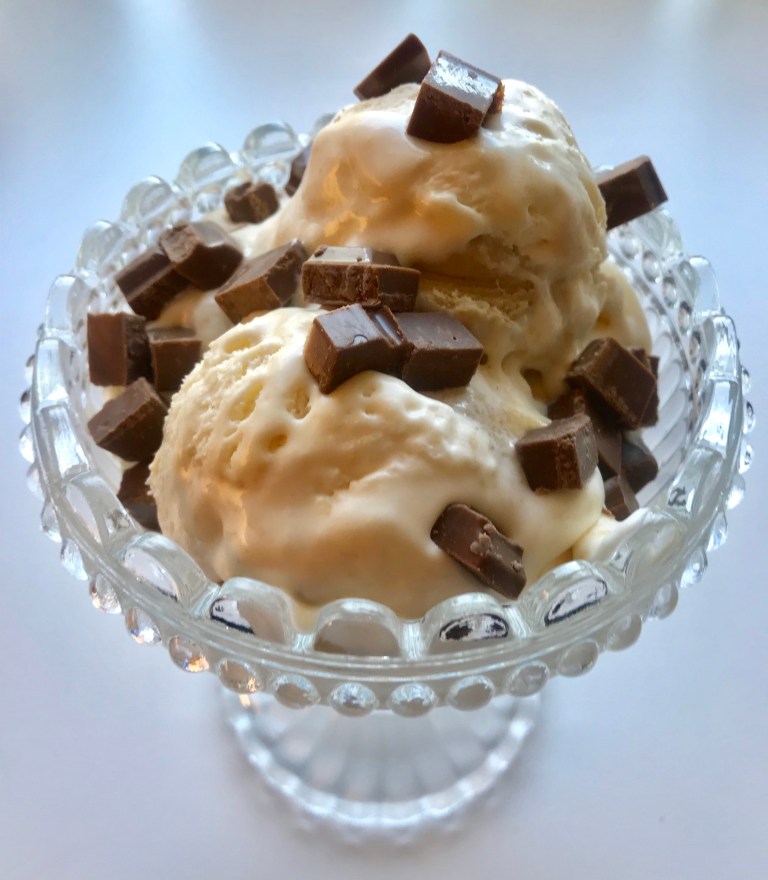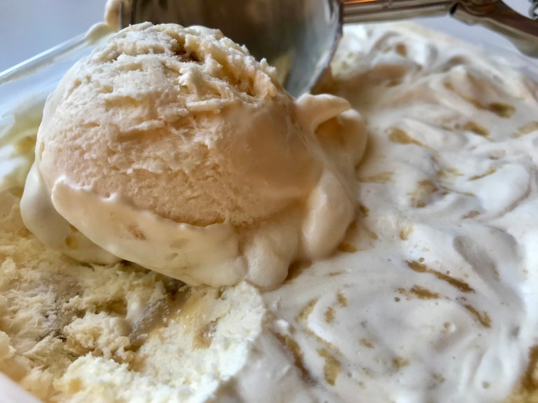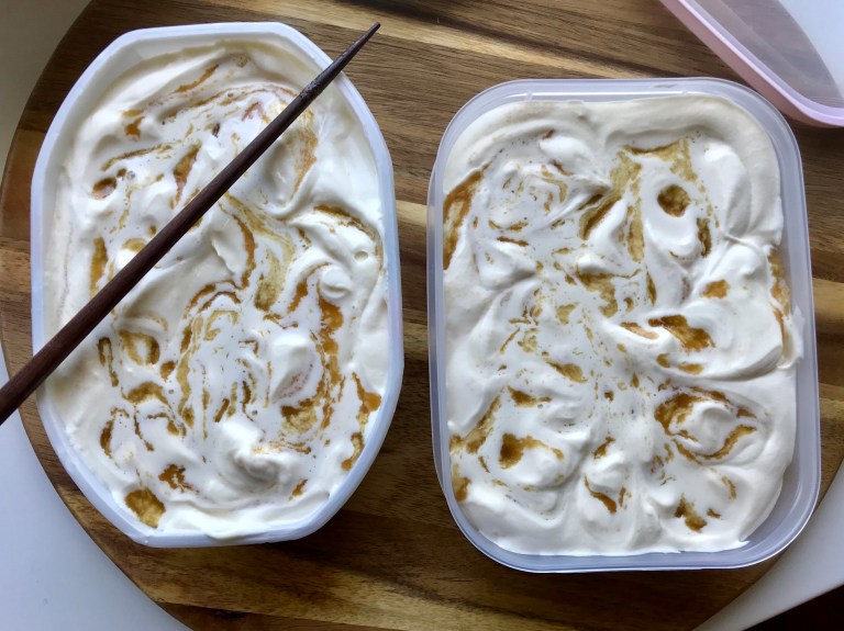 Karamellen må være helt avkjølt før den has i iskremen!