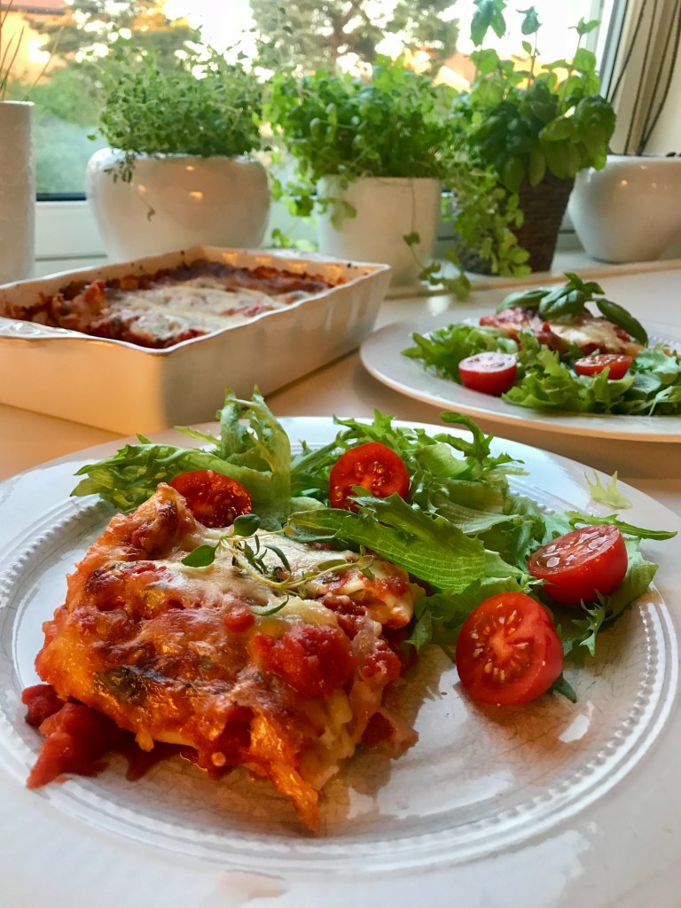 Fordel resten av passataen over og imellom. Strø over hakket basilikum.
