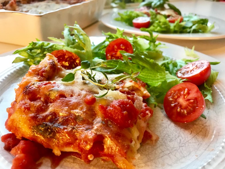 Fordel resten av passataen over og imellom. Strø over hakket basilikum.