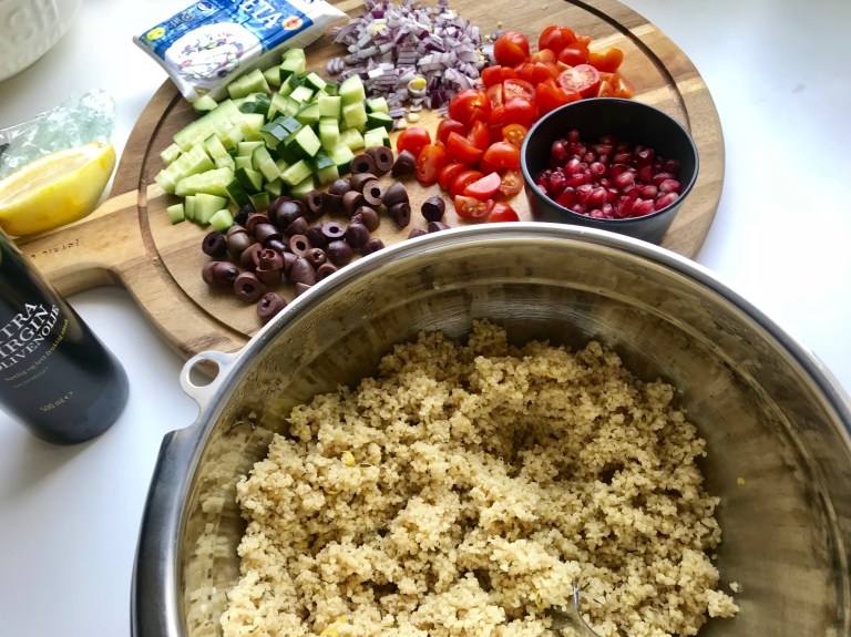 Ha couscous i en bolle sammen med timian, basilikum, pepper, salt og revet sitronskall.