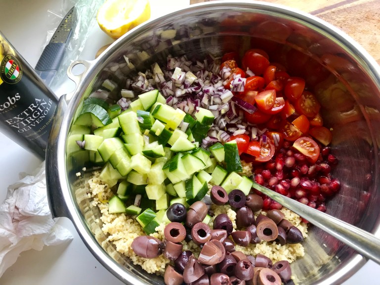 Ha i tomater, rødløk, agurk, granateple, oliven og olivenolje.