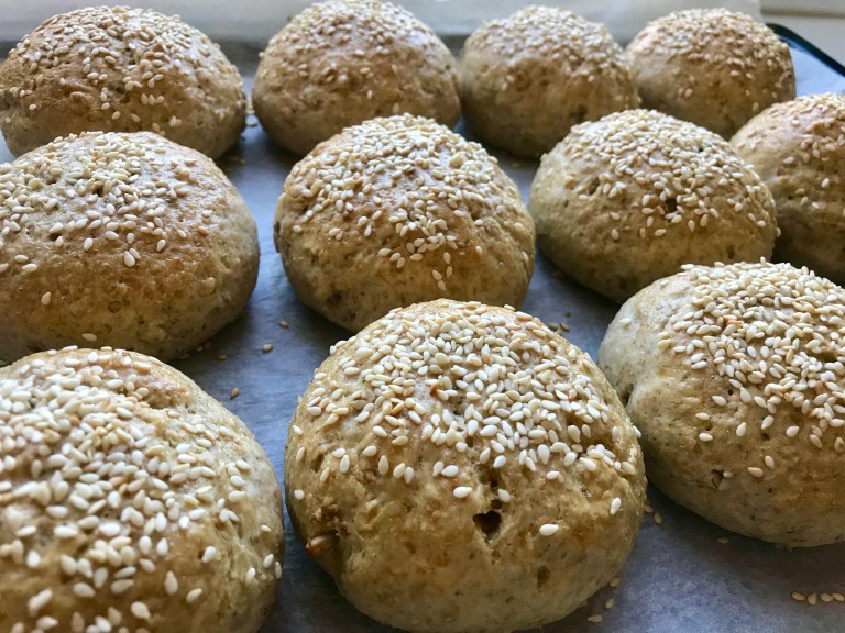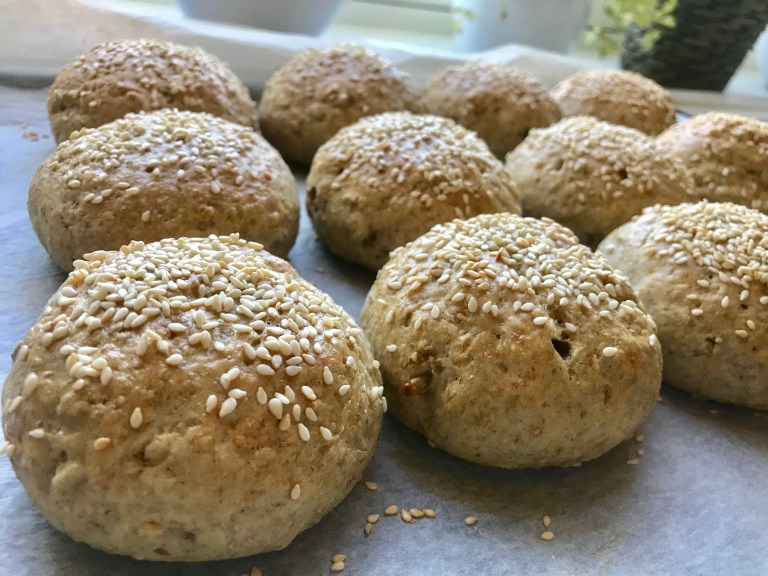 Pisk sammen egg og 1 ss vann og pensle rundstykkene. Strø over sesamfrø.