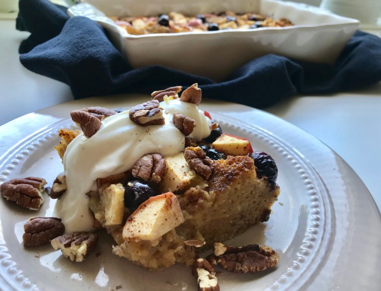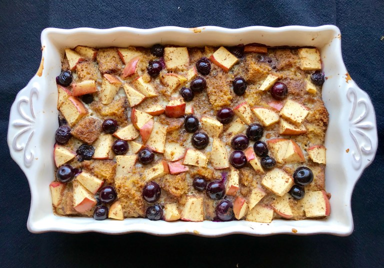 Ha maisbrødterninger i en smurt ildfast form og strø over eple og blåbær.