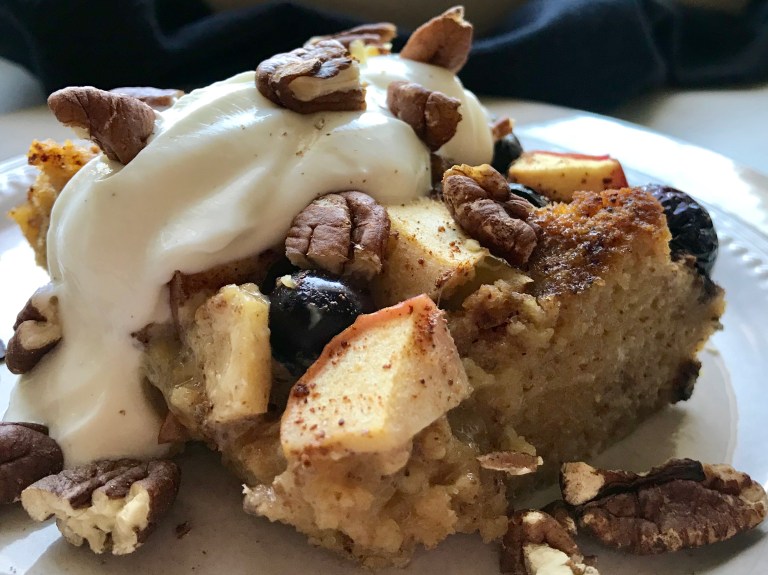 Ha maisbrødterninger i en smurt ildfast form og strø over eple og blåbær.