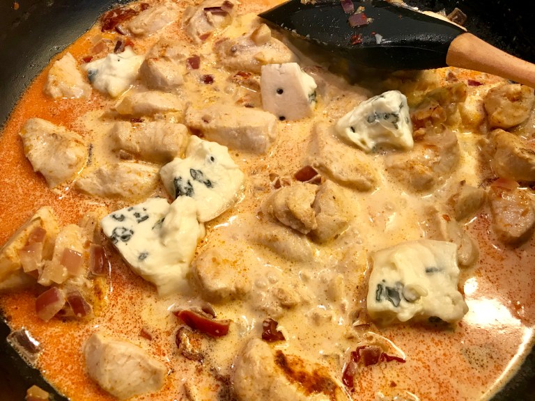 Tilsett blue cheese i biter og rør det godt inn i sausen til det er smeltet.