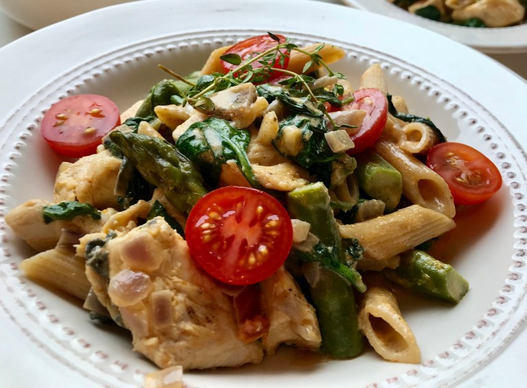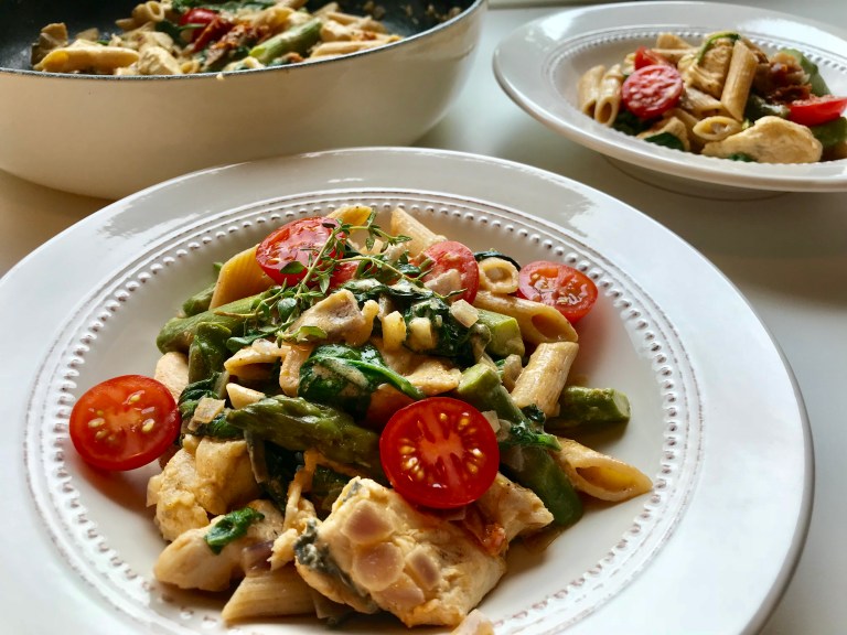 Nå vendes den kokte pastaen, asparges og spinaten inn.