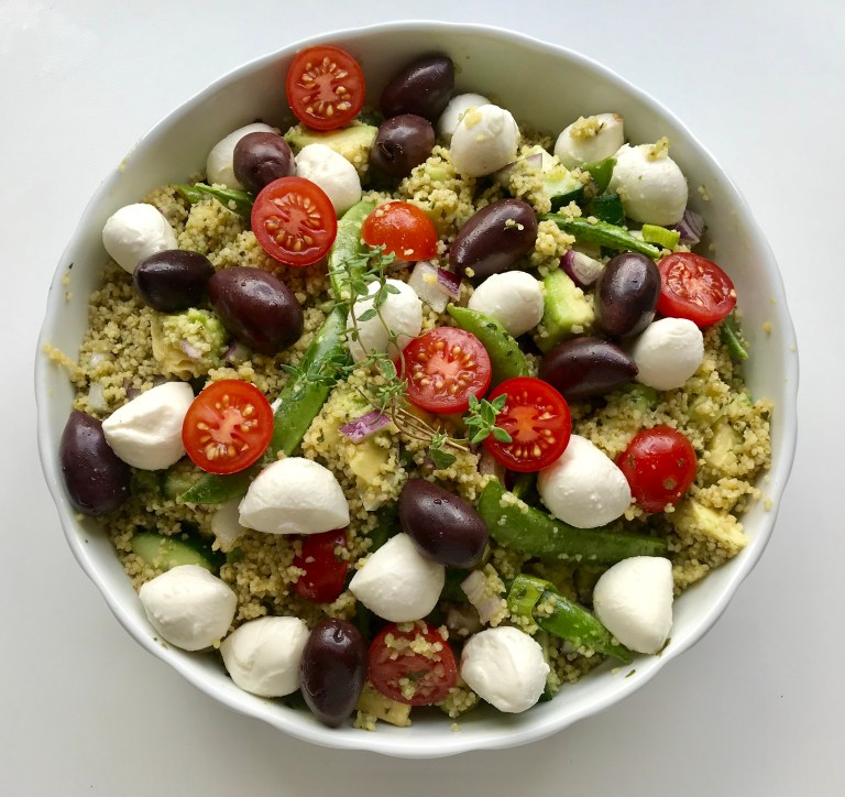 Sommersalat med deilig hjemmelaget pesto. Passer også fint som siderett.