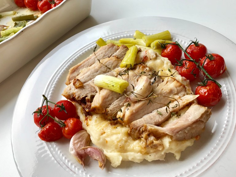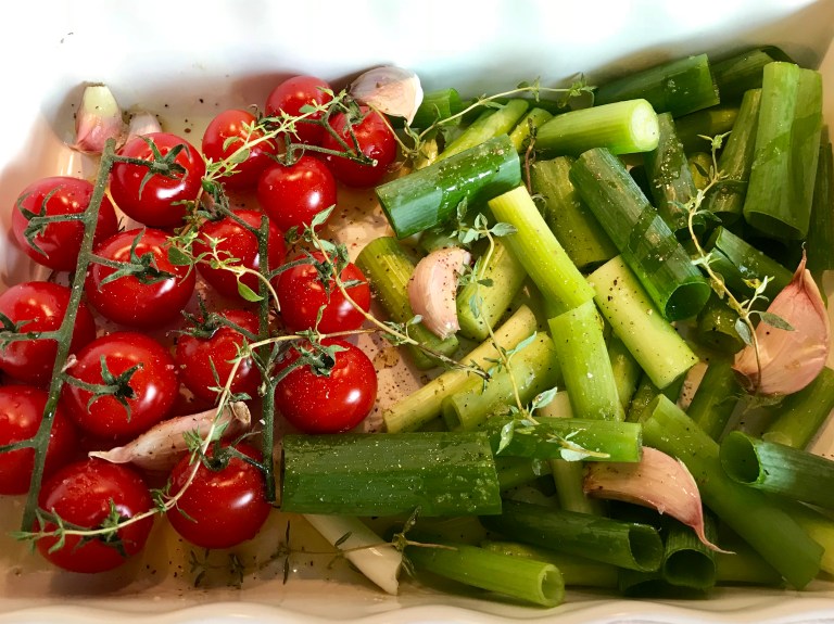 Legg tomatene og vårløk i en ildfast form sammen med hvitløksfedd og timian.