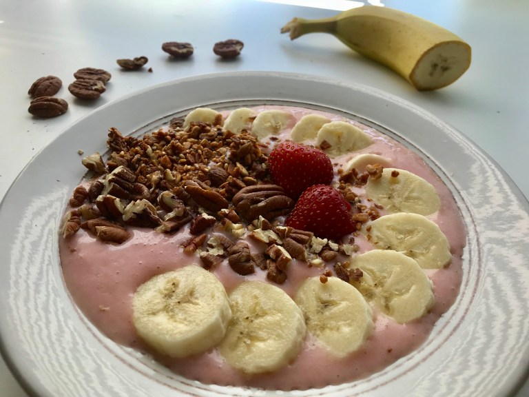 Har du ferdig smoothie fra før så er det bare å legge på toppingen.