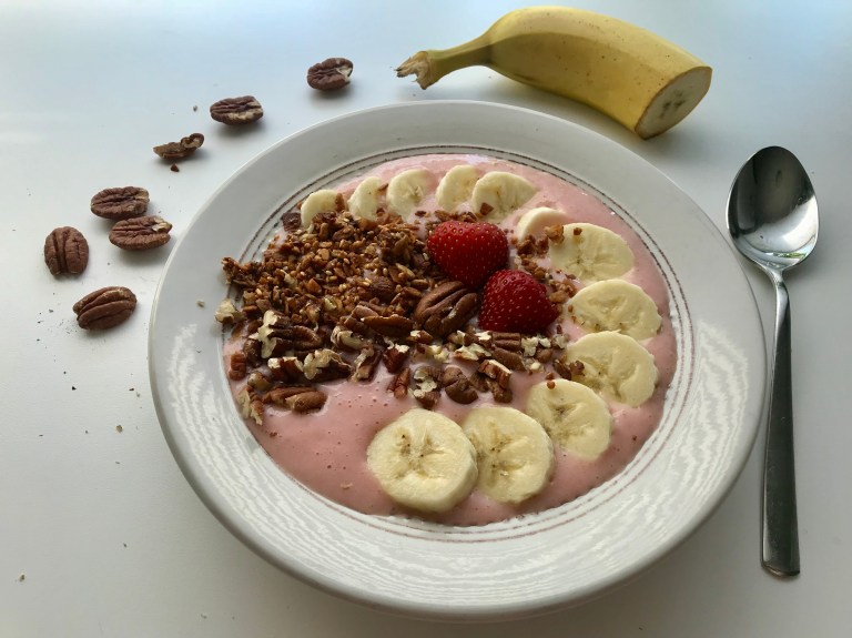 Har du ferdig smoothie fra før så er det bare å legge på toppingen.