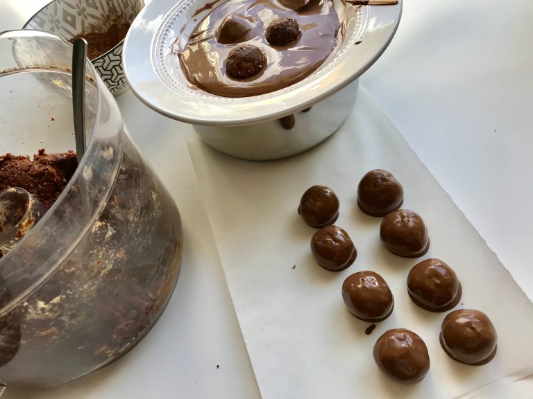 Rull halvparten av kulene i kakaopulver og halvparten dypper du i sjokolade.