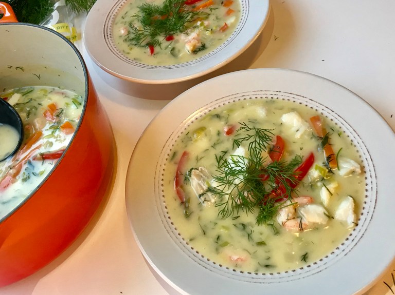Hell over fiskebuljongkraft, matfløte og grovhakket dill og la det småkoke i 5 minutter.
