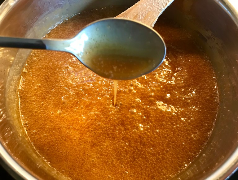 Når sukkeret har smeltet, det har boblet godt i et par minutter og blitt mørkere,