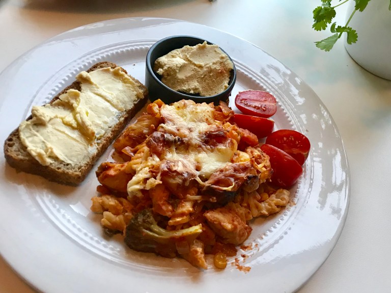 Bre pastablandingen over og resten av kylling/grønnsaksmiksen på toppen.