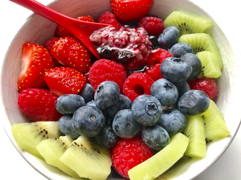Legg på solbærsyltetøy, bær og kiwi og ta med deg hele glasset,