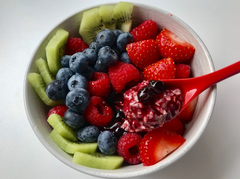 Legg på solbærsyltetøy, bær og kiwi og ta med deg hele glasset,