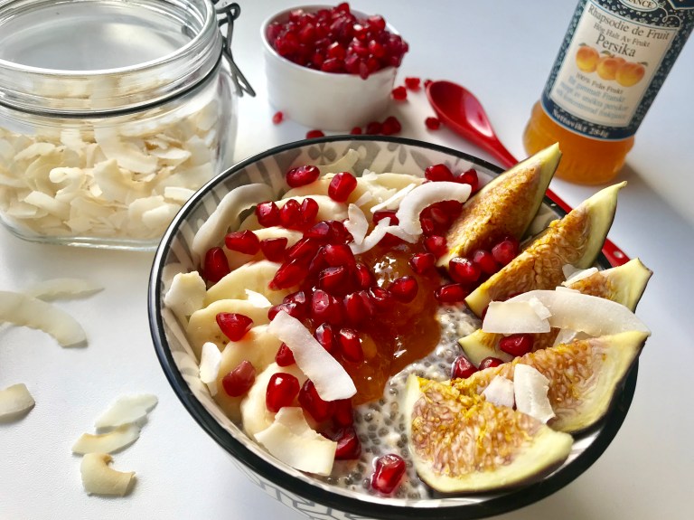Ha på syltetøy og legg på banan og fiken og topp med granateple og kokos.