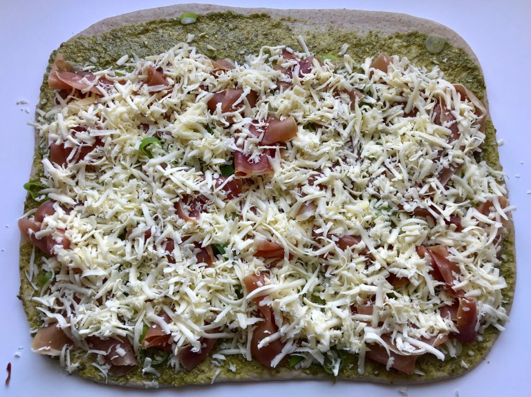 Smør på passe mengde pesto, fordel vårløk, serrano og revet ost over.