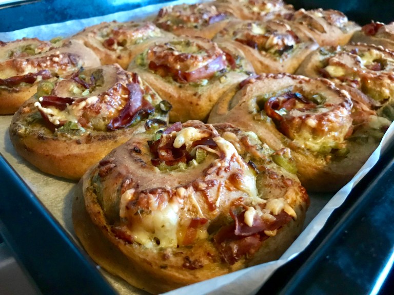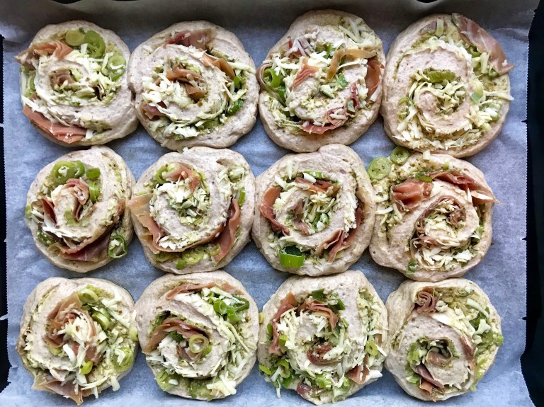 Disse pestosnurrene, eller lunsjsnurrer, er laget på surdeig som hevemiddel,