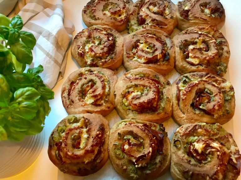 Disse pestosnurrene, eller lunsjsnurrer, er laget på surdeig som hevemiddel,