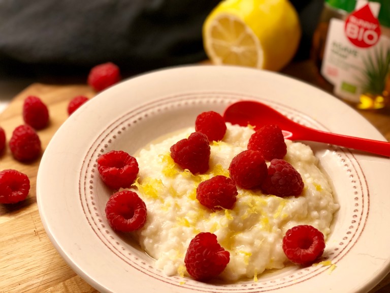 Serveres rykende varm i skåler og ha over sirup, revet sitronskall og bringebær.